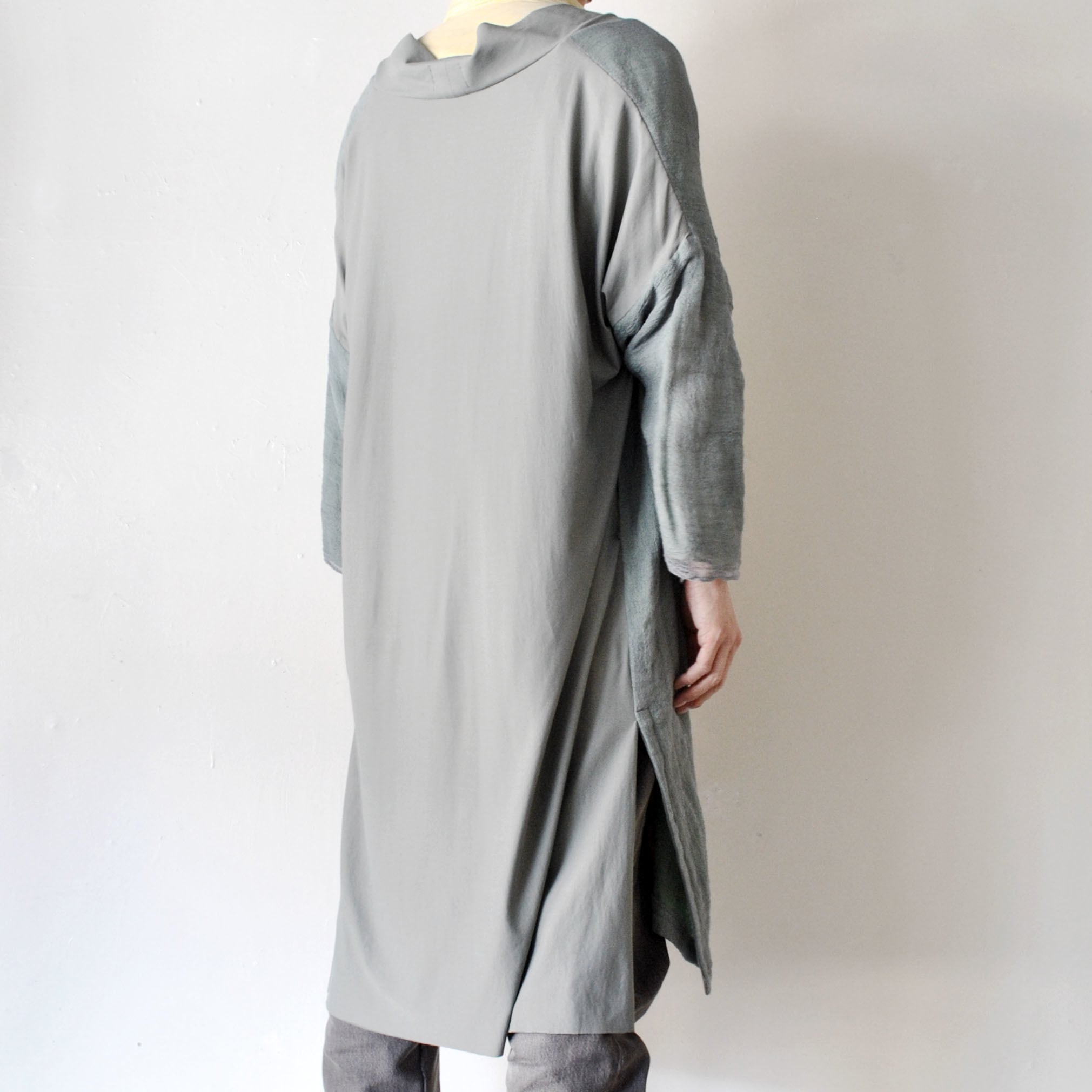 手染めした、ガーゼ素材を3重にレイヤードしたガウンジャケット。