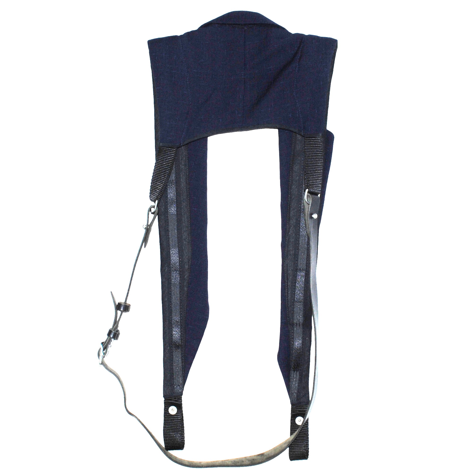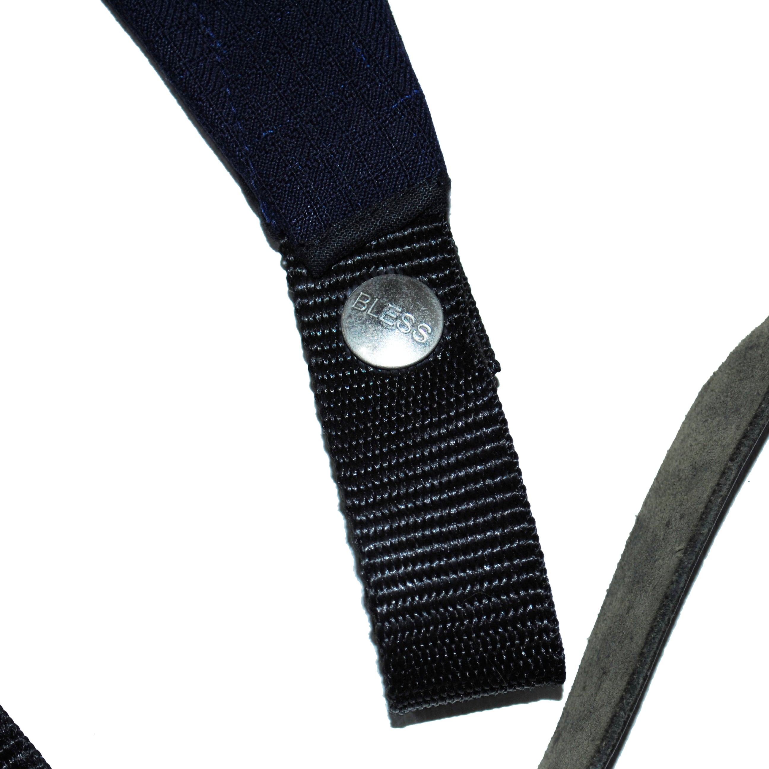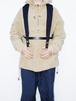 フロントのスナップ部分のところにショッパーなどをつけて使用します。ショルダー部分のストラップはバックパックなどで使用されるクッション性の素材になります。