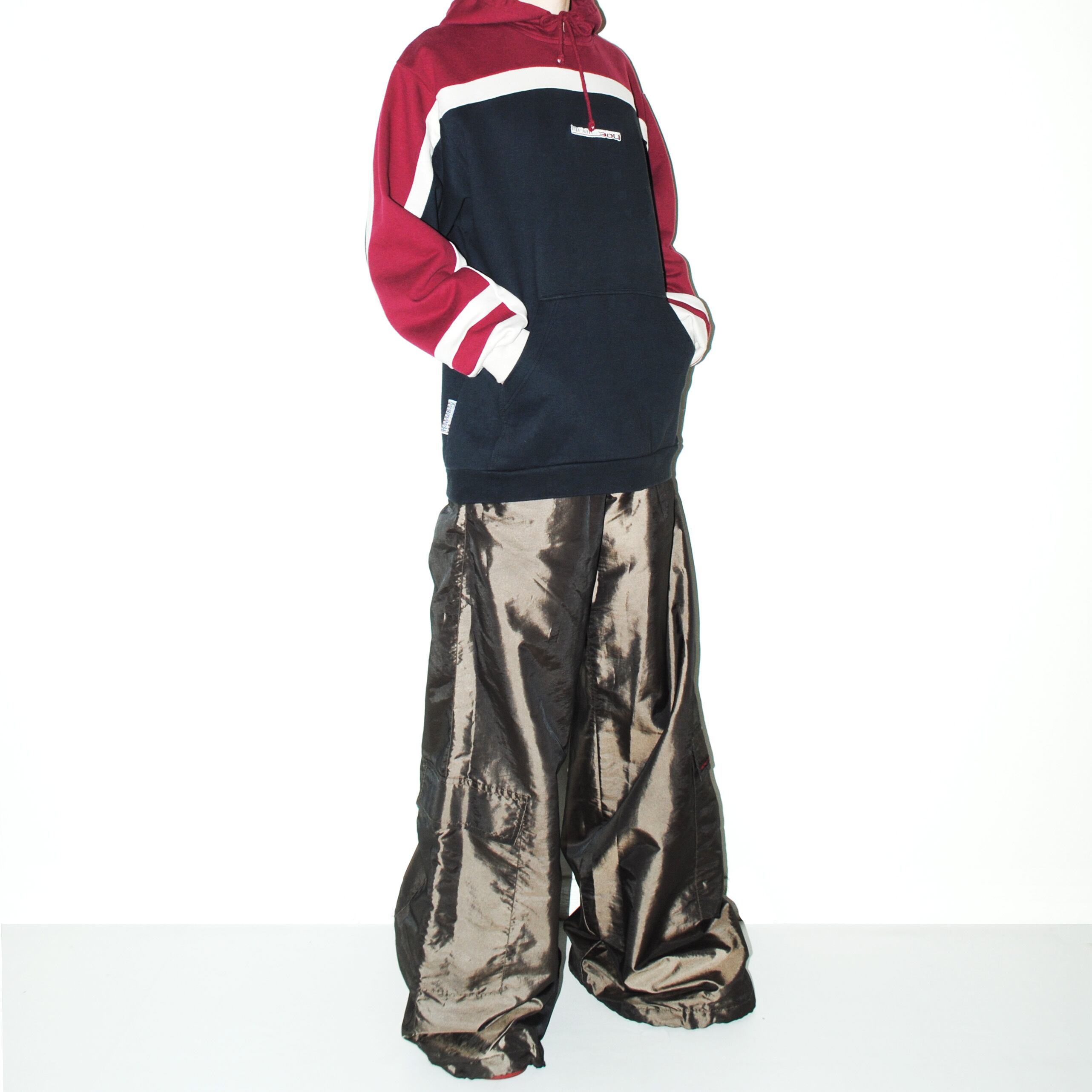 光沢ある素材で、ウエストと裾周りはドローコードで調節可能です。